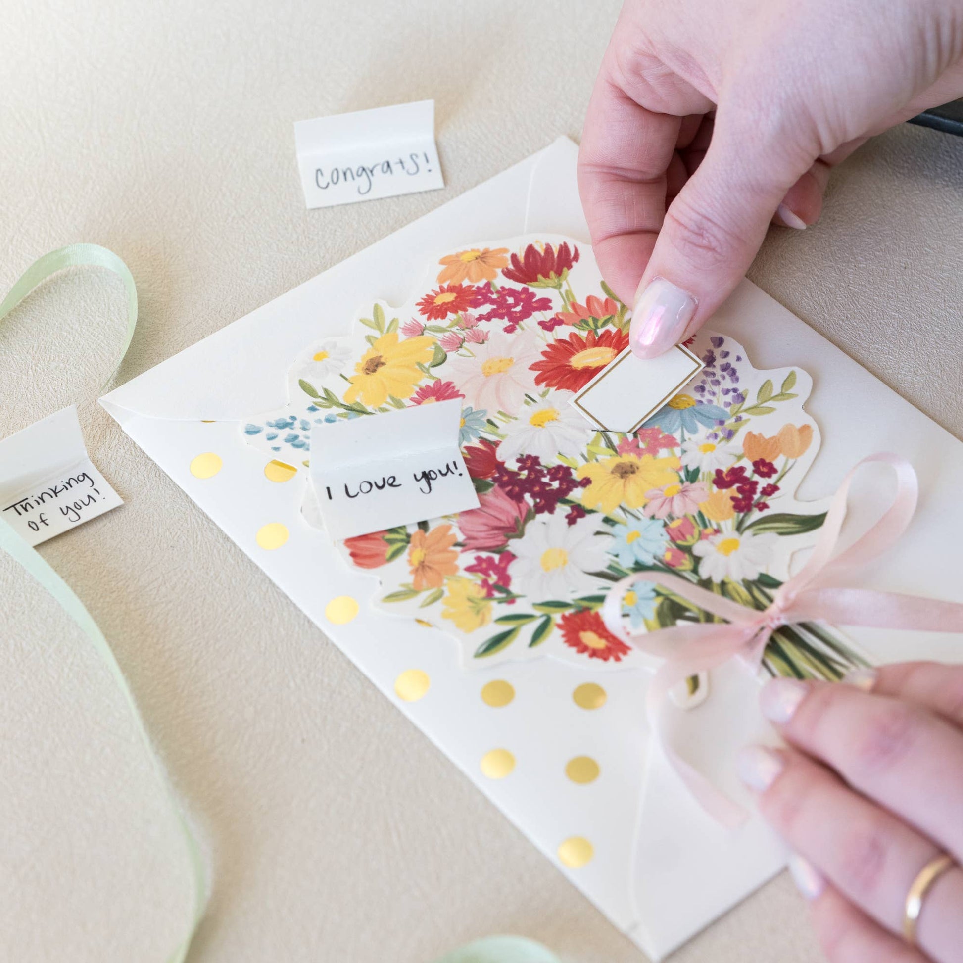 A beautiful bouquet of wildflowers with a silk ribbon & a mini gold foiled card. An extremely versatile card: Birthday, Congrats, Sympathy, Thank You, Valentine's, Mother's Day, Housewarming, Anniversary, etc. The possibilities are endless. A7 Card Does not open, blank on the backside to write a longer note if desired Mini Gold Foiled Card (1/2"x1" when folded, 1"x1" when opened) tucked into a slit White envelope Foiled Gold Dot Liner.