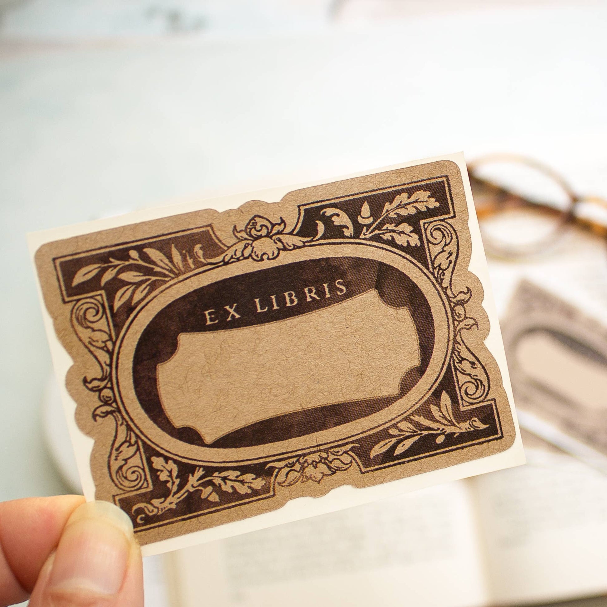 These acorn bookplate stickers feature an ornate autumn themed frame in shades of rustic browns. Packaged in a set of five self-adhesive, peel and stick, acid-free sticker labels. Printed on smooth kraft quality label sheeting. Approximately 3" across and 2 1/4" high.