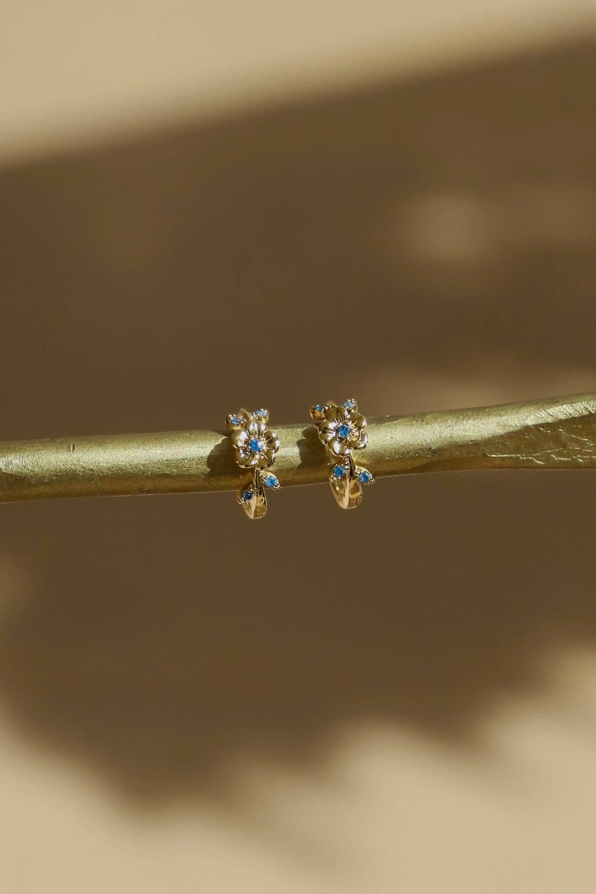 Delicate in scale yet rich in detail, these small gold huggie earrings are designed for everyday elegance. Intricate floral motifs frame soft aquamarine-toned stones, creating a gentle interplay of shimmer and color that feels refined without being overstated.