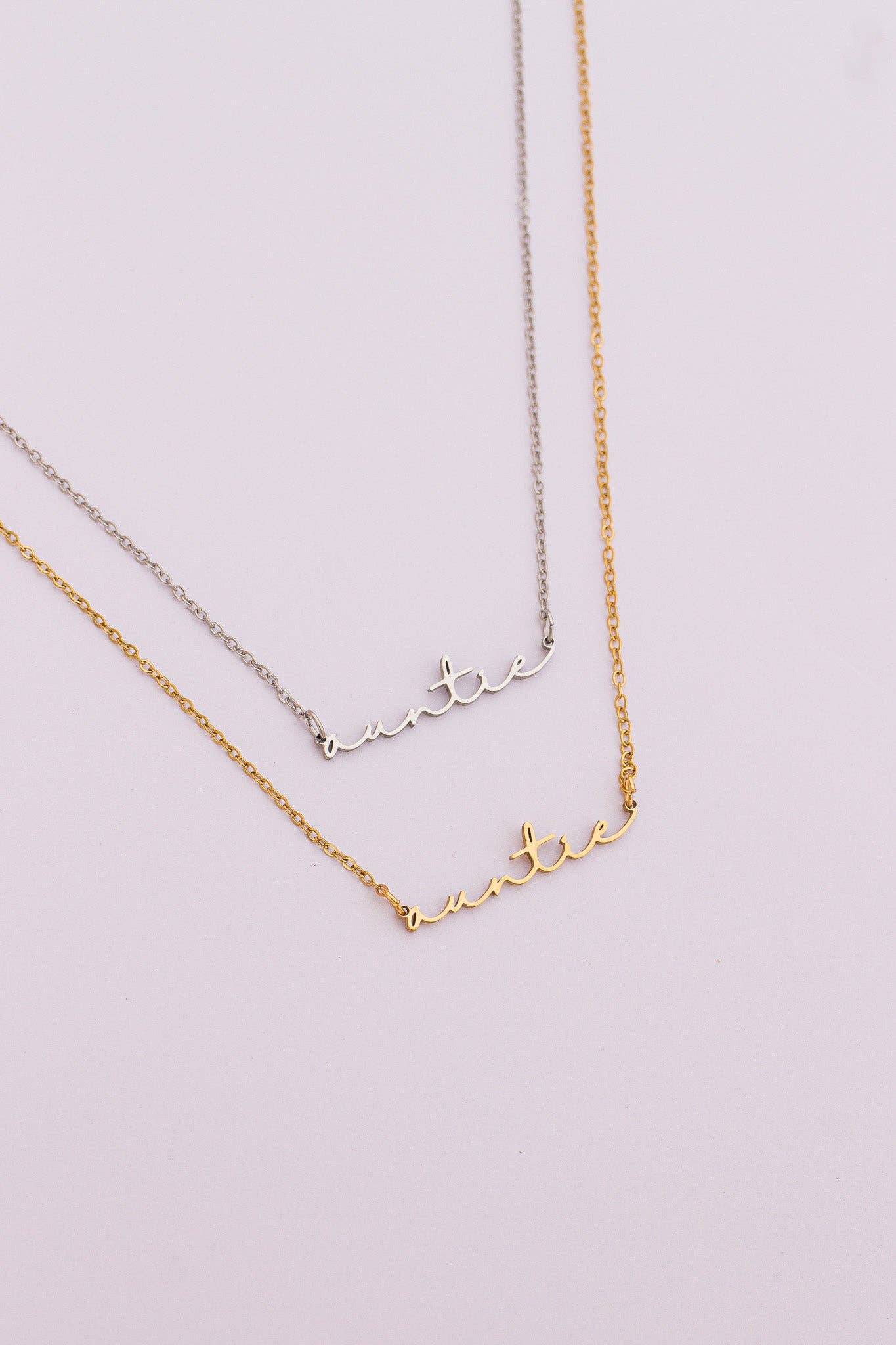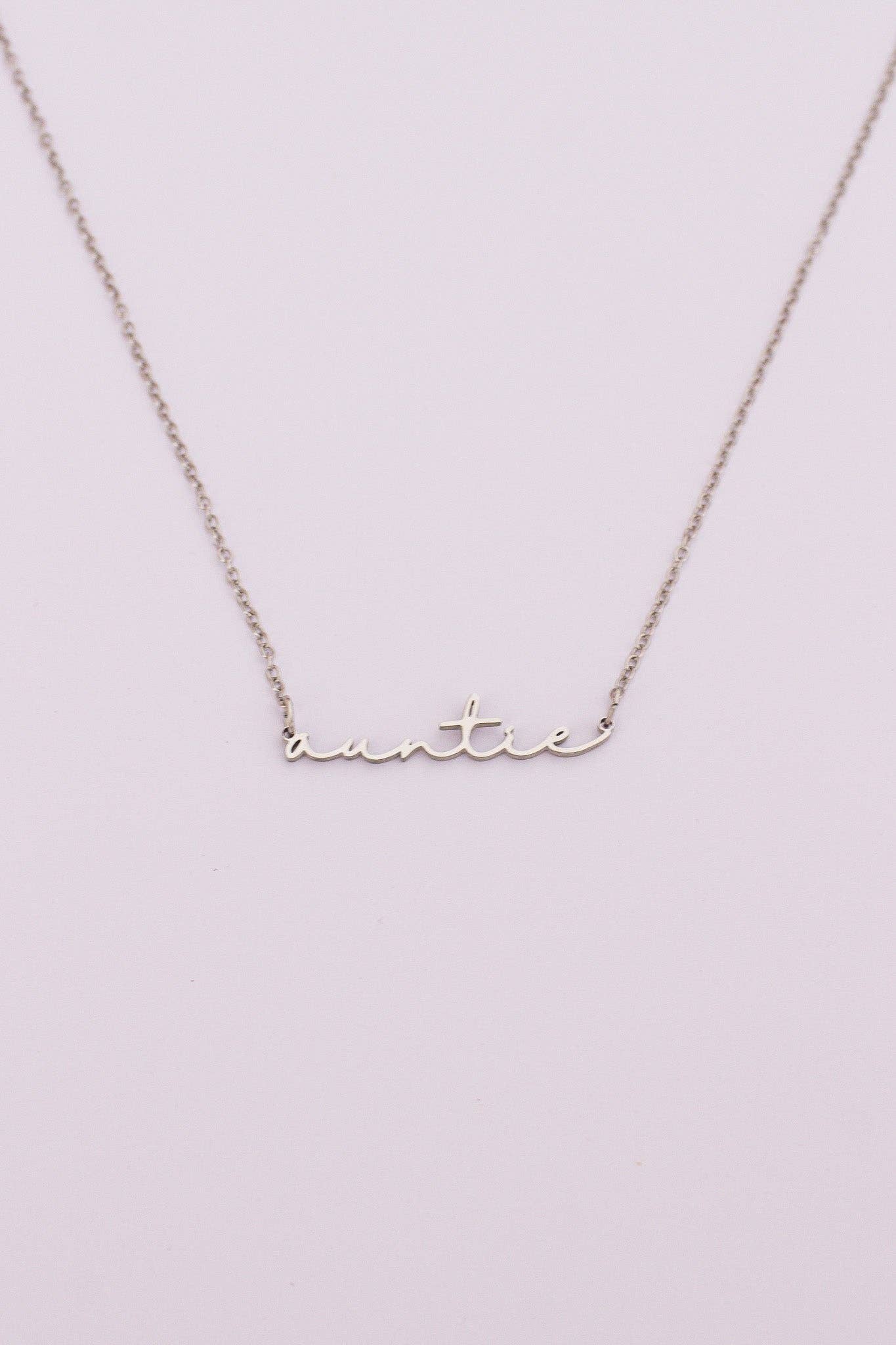 Meet the Auntie Necklace! A perfect little dainty piece featuring "auntie" written out in cursive script font. Tarnish Free & Waterproof - Shower, Sweat and Pool Safe. Hypoallergenic and Sensitive Skin Safe. 18k Gold Plated Stainless Steel. Adjustable from 16-18.5 inches in length.