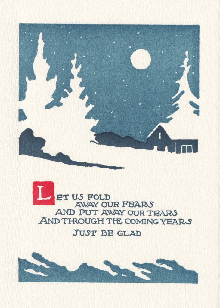 A peaceful moonlit scene featuring snow-covered evergreens and a rustic cabin creates an atmosphere of quiet contemplation perfect for year-end reflection. The inspirational verse "Let us fold away our fears and put away our tears and through the coming years just be glad" adds meaningful depth. Letterpress printed. Deckle edged paper. Inside reads: "May you find happiness throughout the coming year"