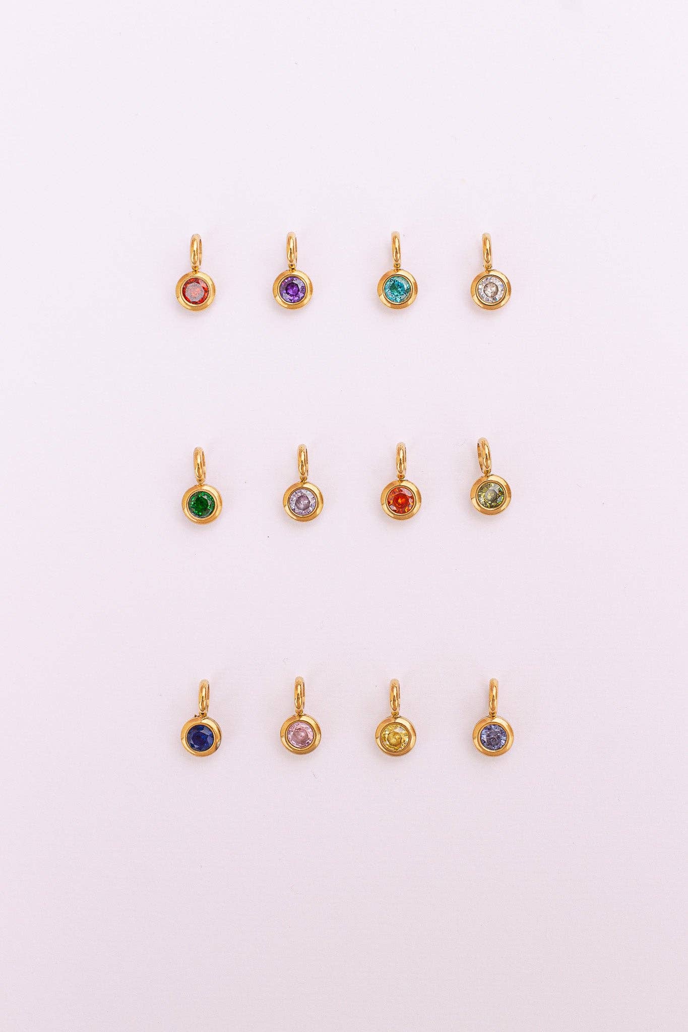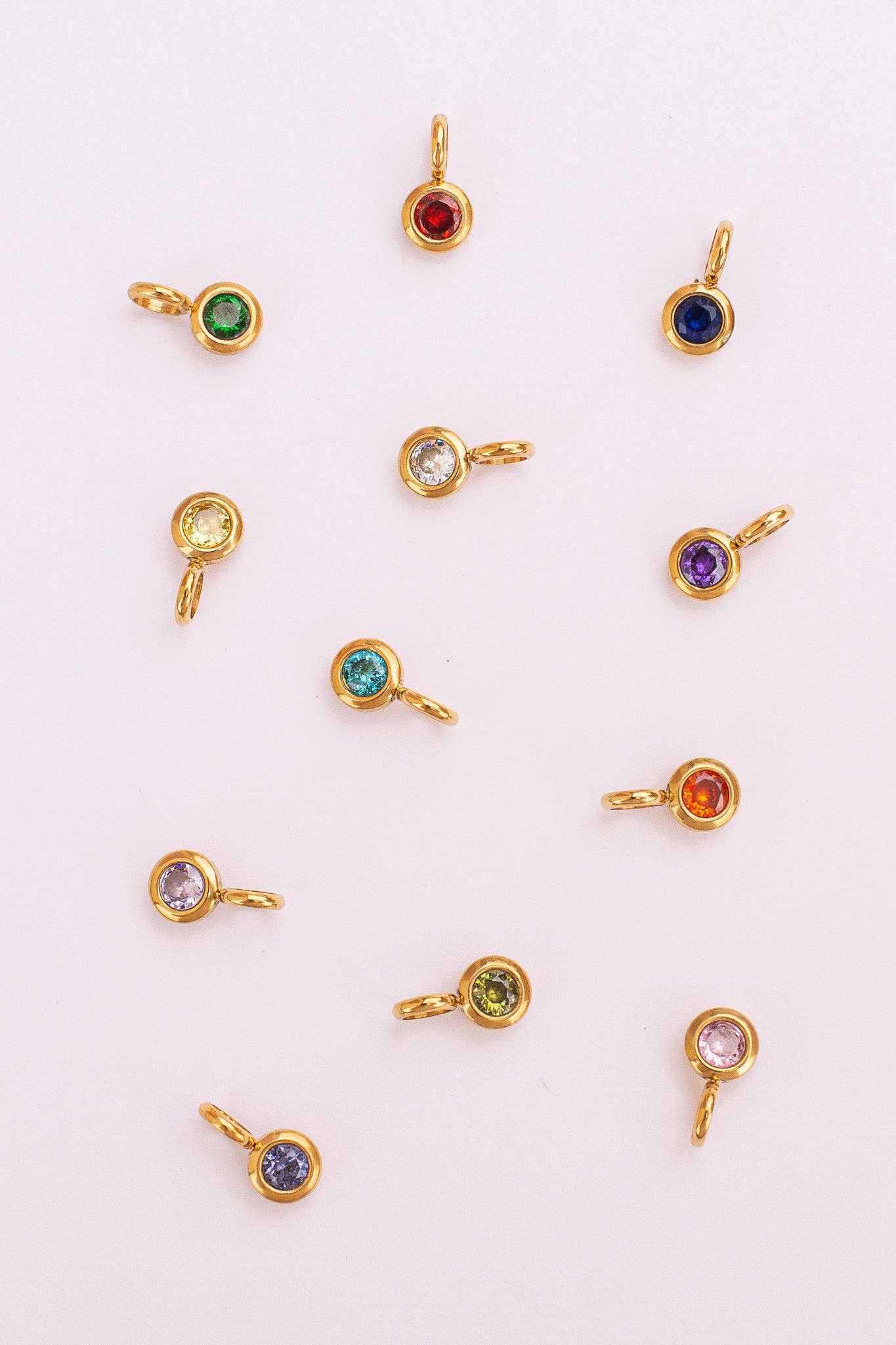 Cubic Zirconia Birthstones made with 18k Gold Plated Stainless Steel. Waterproof- Shower and Pool Safe! Hypoallergenic and Sensitive Skin Safe. Tarnish Free. Each Charm is .25 inches in length. Pair with out plain gold necklace chains and other charms for a truly custom piece.