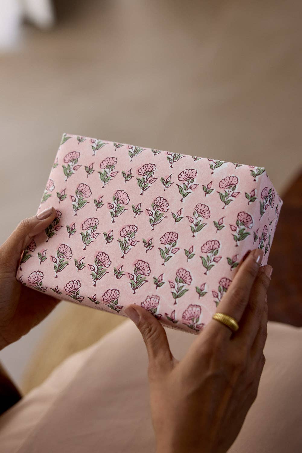 Printed by hand in small batches, these block-printed wrapping paper sheets celebrate the beauty of traditional craftsmanship. Each design is built impression by impression, with artisans carefully aligning every block to create a sense of rhythm and balance. The result is a pattern that feels both precise and human, with subtle variations that make every sheet its own.