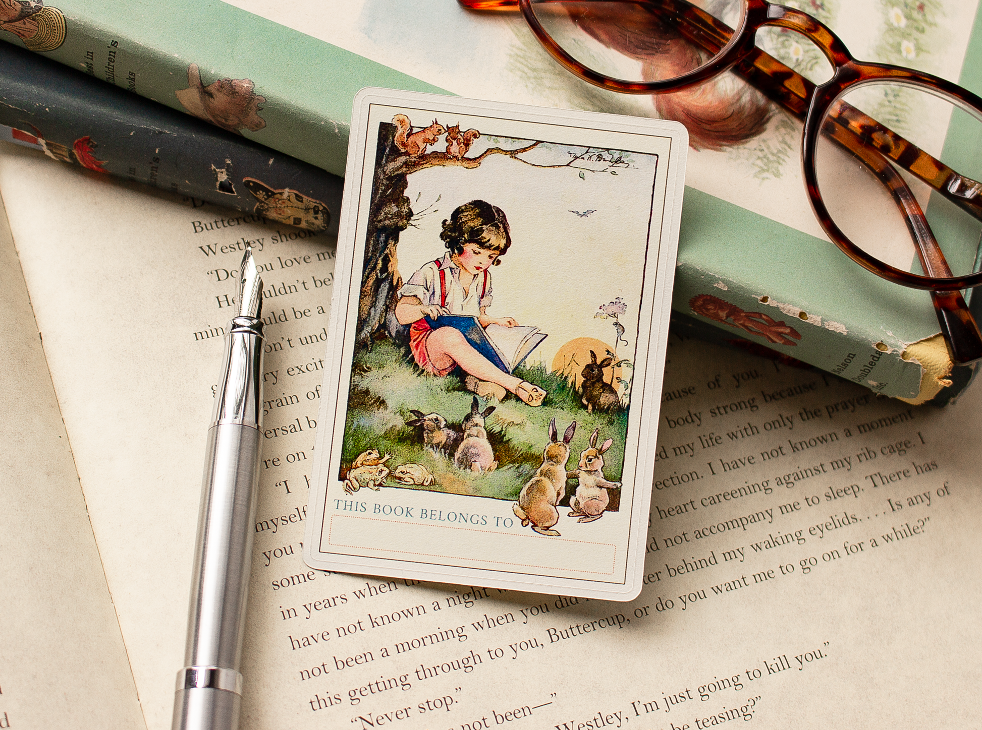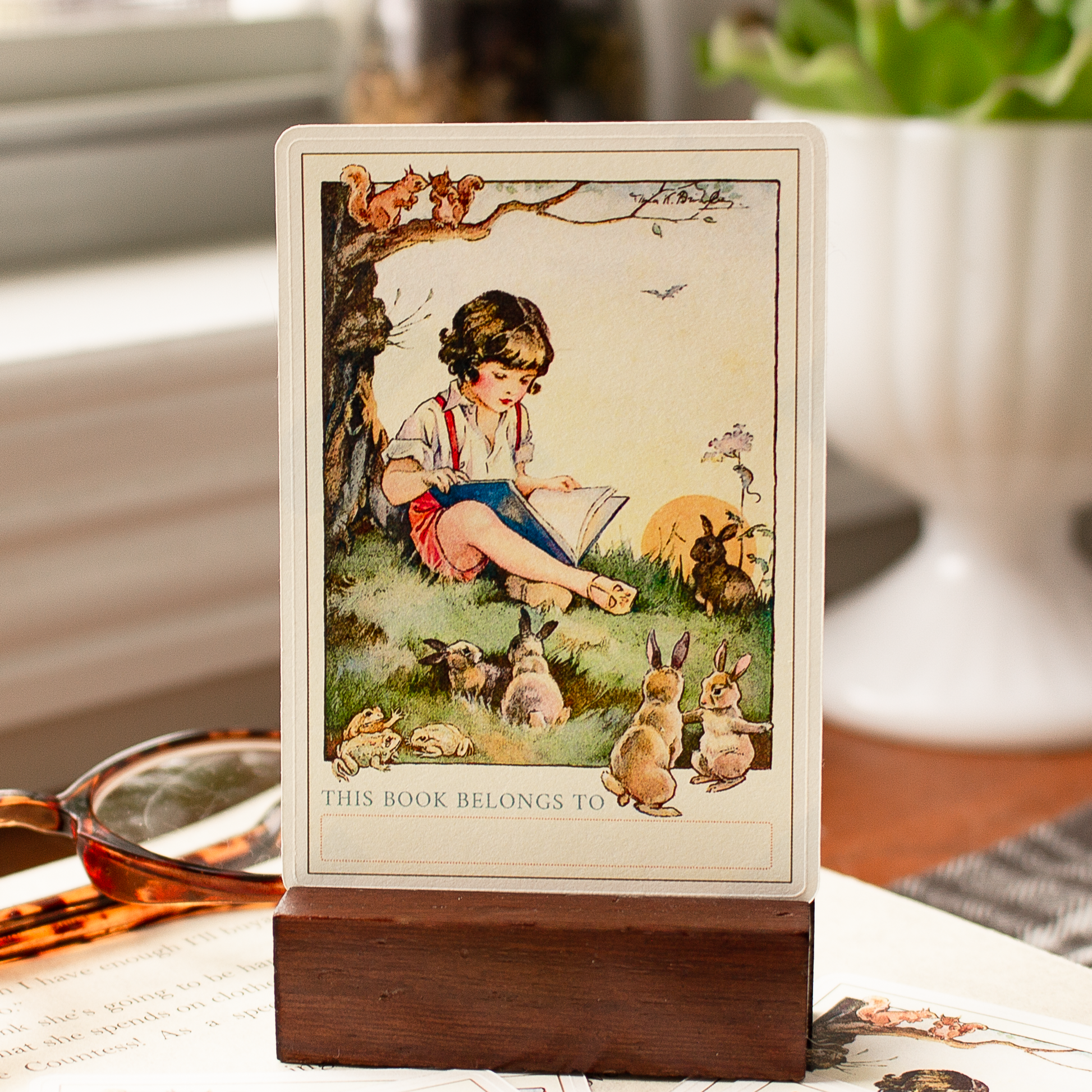 These kids' bookplate stickers are just the right touch. Featuring a charming vintage illustration of a child reading to an audience of bunnies and frogs. Once upon a time... Packaged in a set of five self-adhesive, peel and stick, acid-free sticker labels. Printed on smooth fine stationery quality label sheeting. Approximately 2 3/8" across and 3 5/8" high