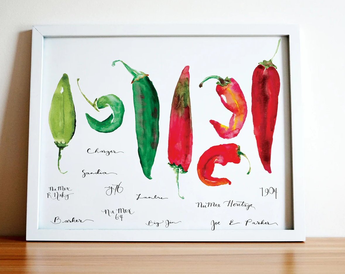 The Hatch Chile Varieties print highlights a few of the common chile varietals grown and sold in Southern New Mexico. These watercolors represent a few common colors, shapes, and styles of the local chile crop.