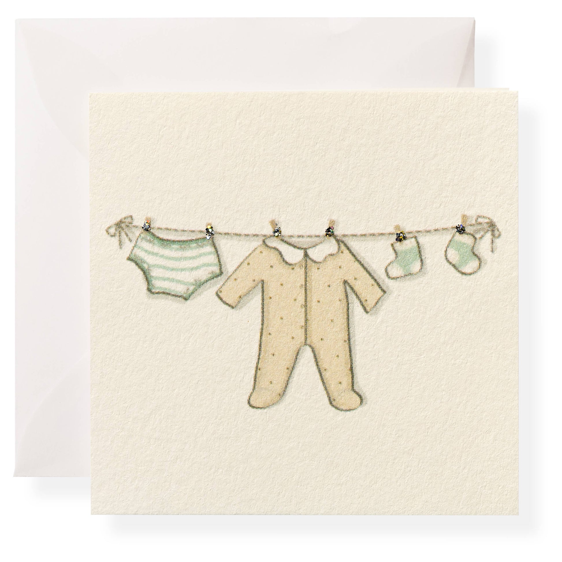 The Clothesline Gift Enclosure is printed and hand-glittered in Memphis, TN. Hand crafted artwork, full color ink printed on natural white paper, hand-glittered, and paired with a vellum envelope. Book-folded enclosure card, blank on the inside. Paper color | natural white. Envelope color | vellum. Print process | full color. Embellishment | hand-glittered. Dimensions | 3 x 3 inches.