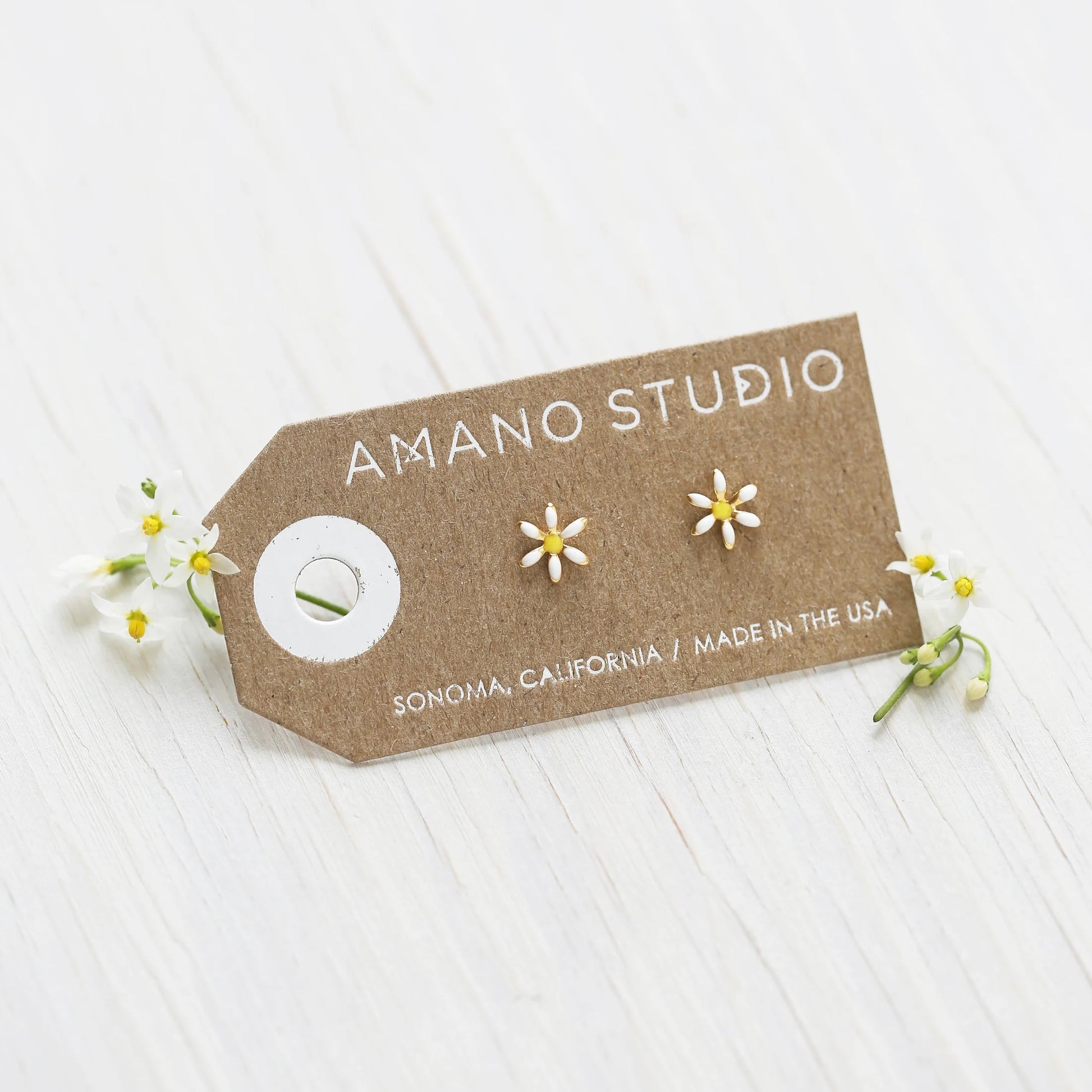 Daisy studs with vintage 70's fashion appeal will brighten up your day. Measuring 1/4", heavy (7-10 mil) 24k gold plated over brass. Hand-painted enamel. Made with vintage molds from New England findings houses.