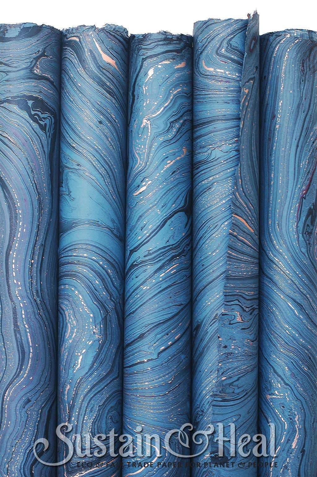 Dark Blue base sheet with natural deckle edge. Black and charcoal with red and metallic gold highlights. Rich and vibrant color. Text weight works well for folding, wrapping, envelope liners and much more. Text weight works well for folding, wrapping, envelope liners and much more. Fair Trade handmade from very durable jute fiber in Bangladesh. The photo shown is a good guide but since each sheet is handmade there may be some variation in color/pattern. 20 x30" with natural deckle edge.