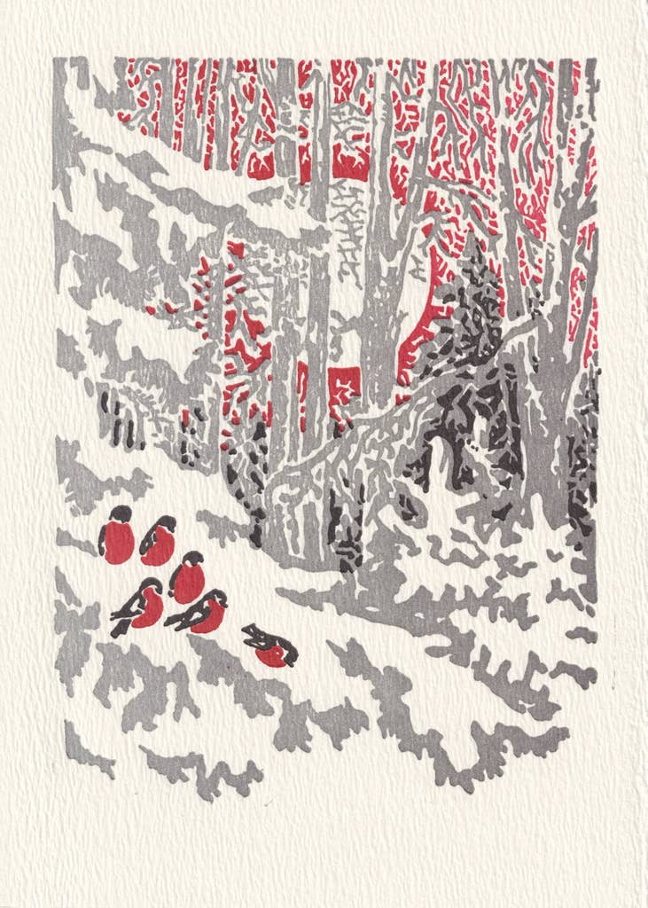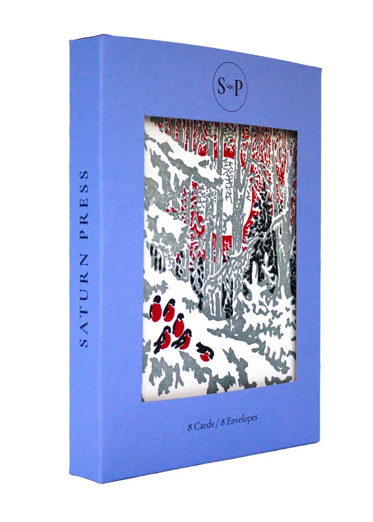 Rich red bullfinches nestled among snow-laden evergreen branches create a captivating scene that celebrates winter's natural beauty. This letterpress card combines traditional holiday colors with an artistic, hand-drawn aesthetic that feels both classic and contemporary. Blue box of eight letterpress cards and matching envelopes. Letterpress printed. Deckle edged paper.