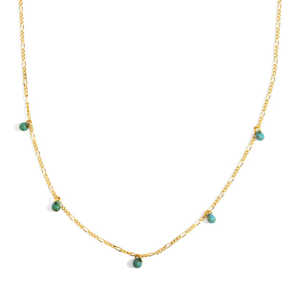 This delicate necklace is lovely worn alone or layered with another piece. Delicate 16" chain, 14k gold over brass, with five stations of Miyuki Japanese seed beads.