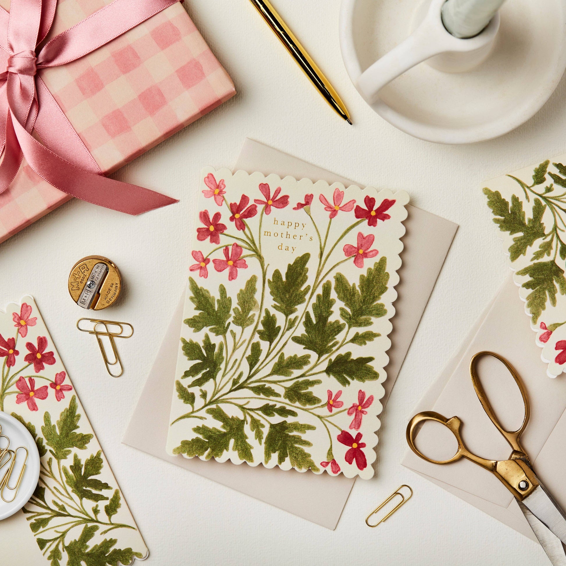 Part of the Flora collection, this card features an all-over floral pattern in soft green and pink, creating a fresh and decorative botanical design. A die-cut scalloped edge frames the artwork, while delicate gold foil details on both the front and back add a refined finishing touch.