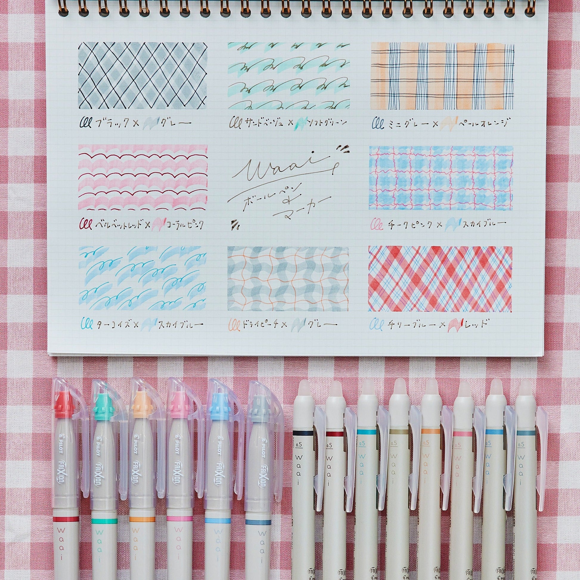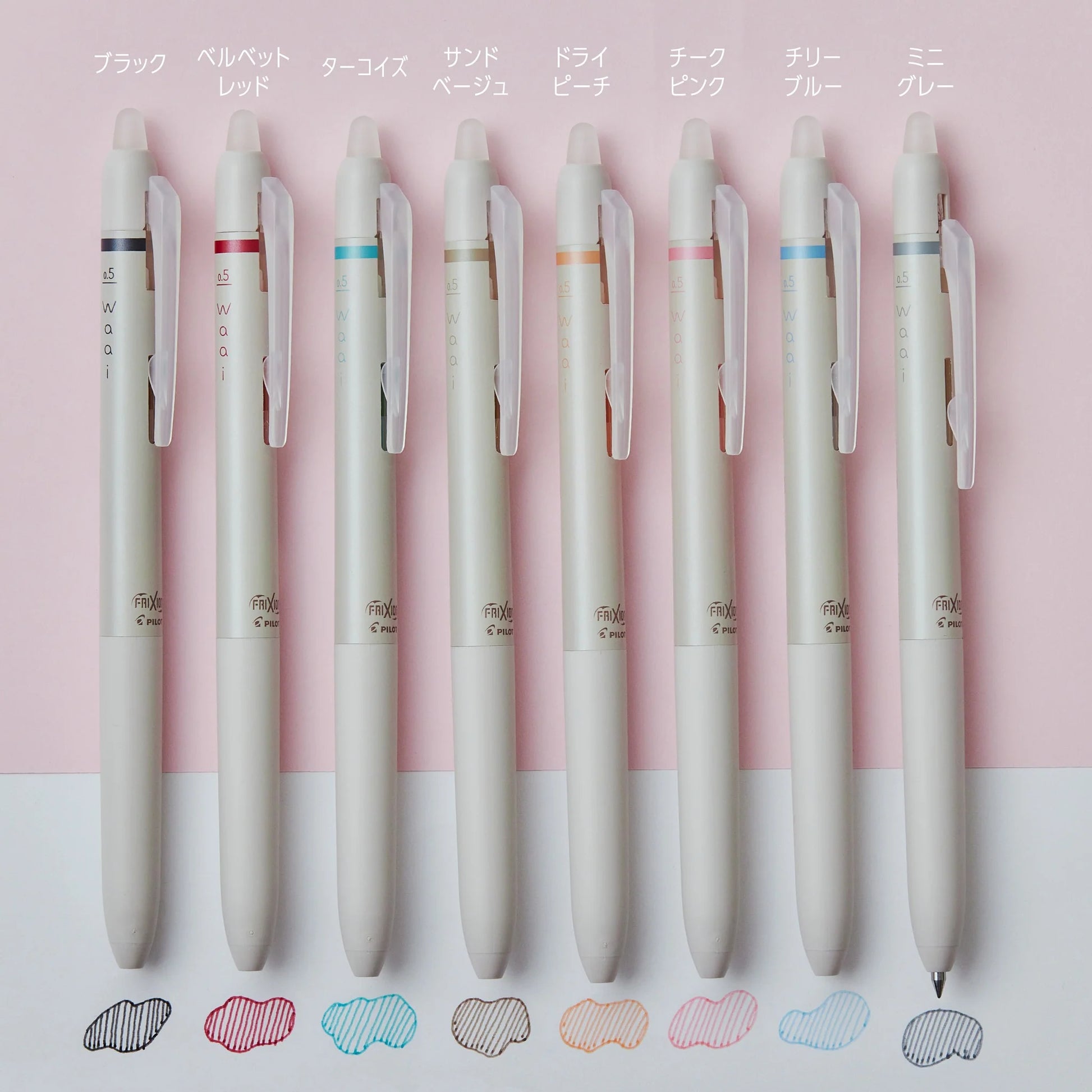 Introducing Pilot's latest Frixion release, the Waai series. Featuring stylish off-white pen bodies and a brand new variety of colors, the Waai series is the perfect addition to your stationery collection. Available in Black, Velvet Red, Aqua, Sand Beige, Dry Peach, Light Pink, Pale Blue, and Gray. Frixion lets us embrace and learn from our mistakes, and the Waai Series allows us to do it in style!