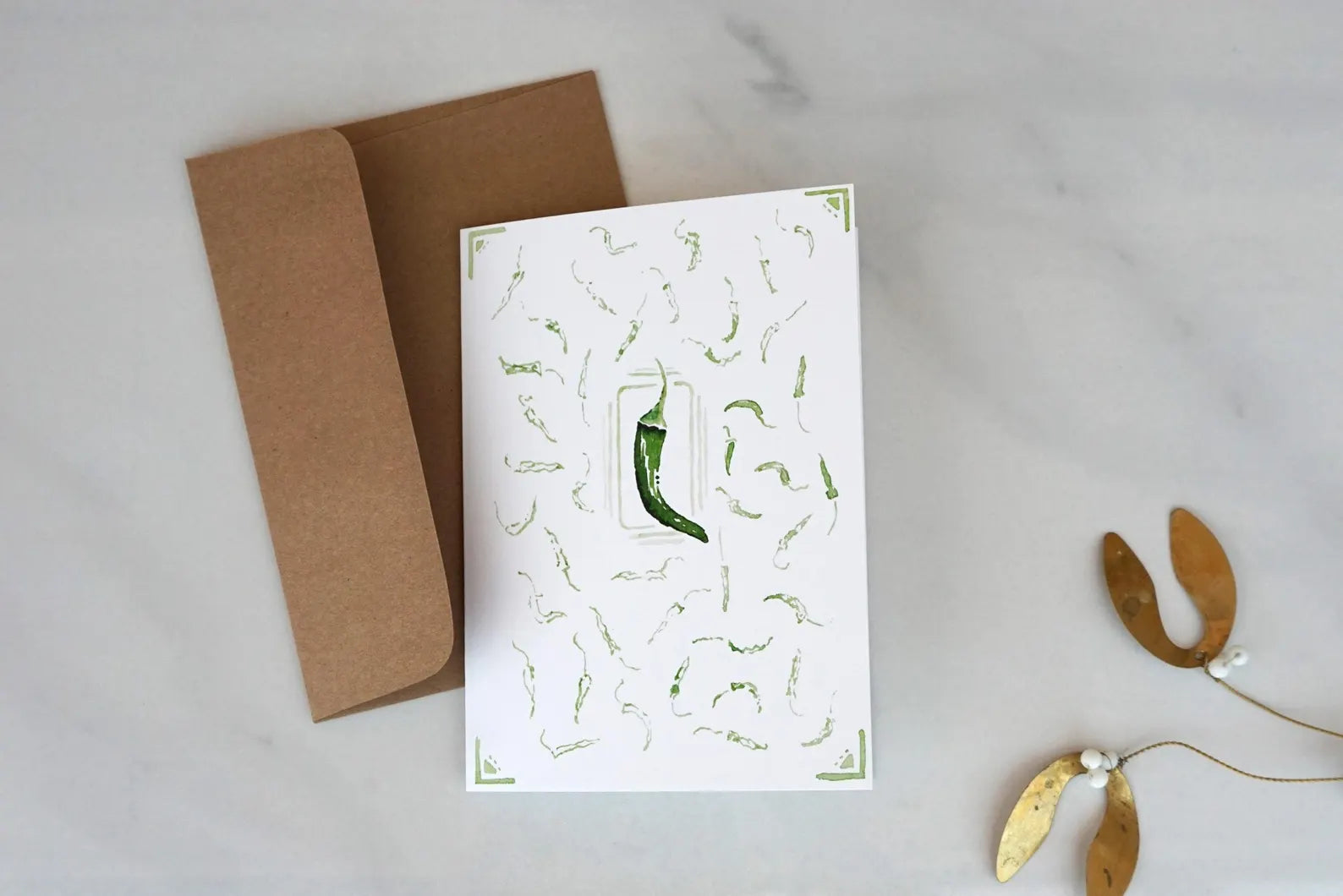 Small dark green chile pepper with loose watercolor border in the center surrounded by small wispy chiles and watercolor design elements in the corners; no words. 5x7" white folded card with a white paper envelope.