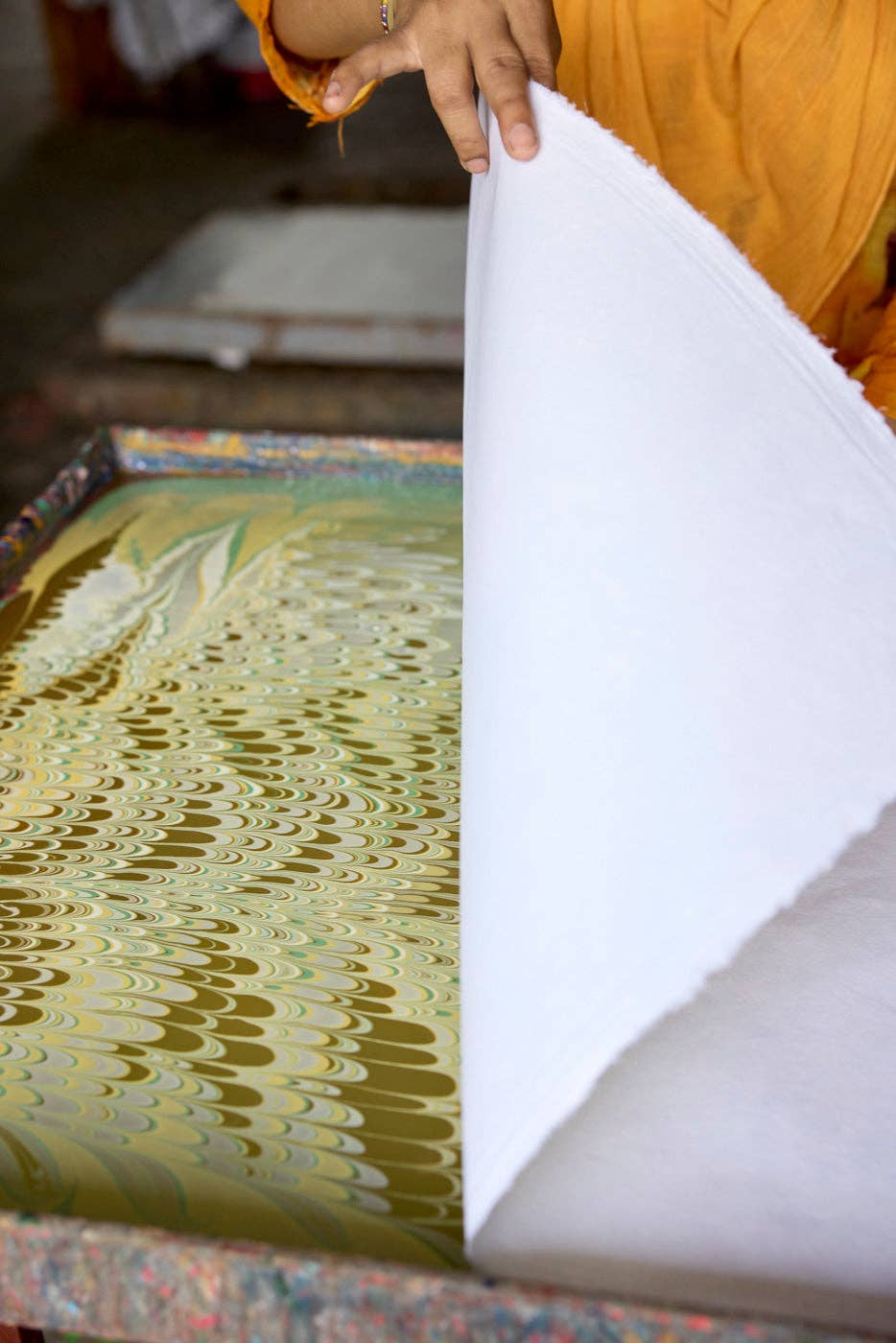 These colorful gift bags are hand marbled and made from a strong 250gsm recycled cotton card paper. The bags are marbled using traditional techniques, and are not digitally mass produced. The cotton rope handles enhance the artisanal look of the bags and the matching swing tag carries a short blurb about the story behind the bags. 100% recycled cotton paper.