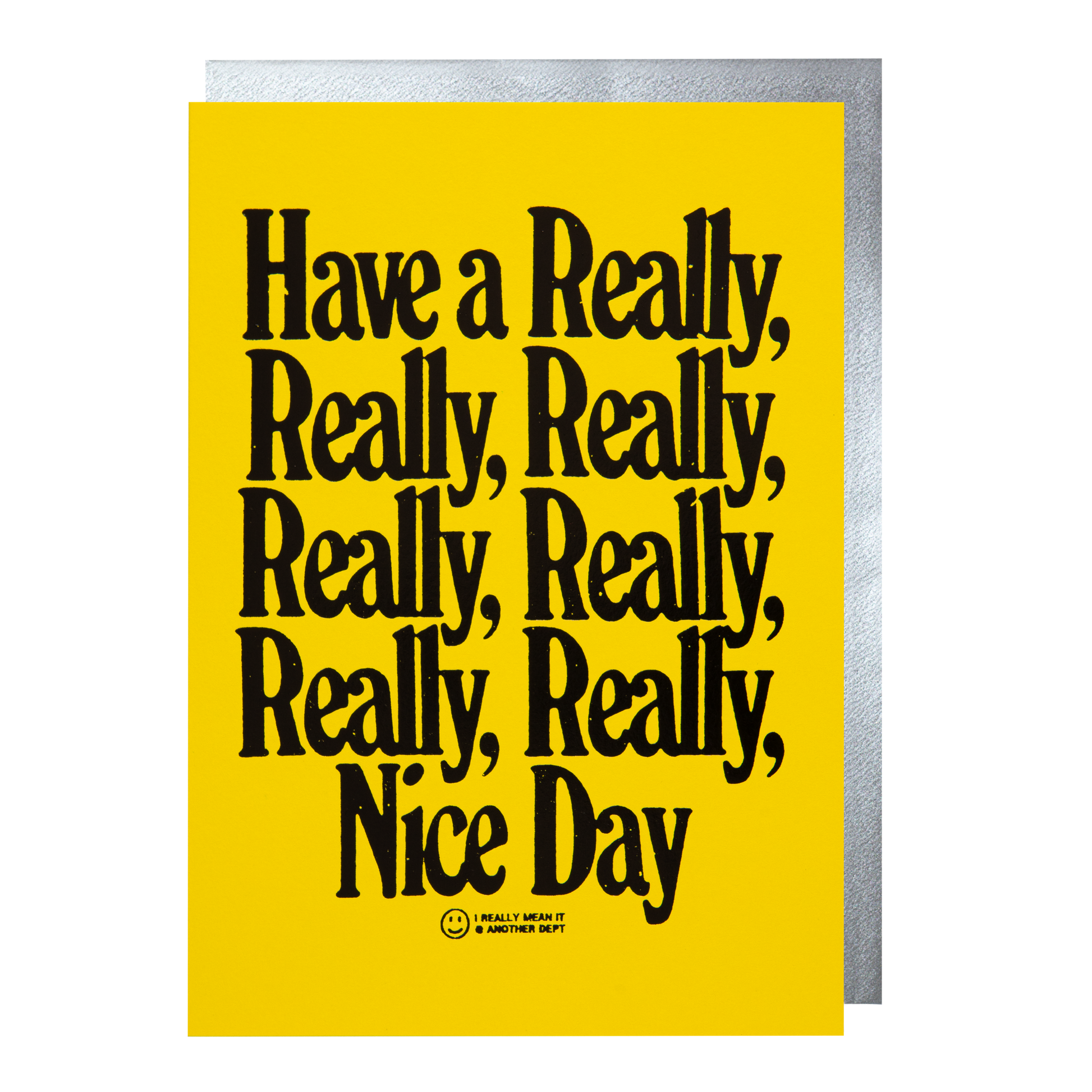 Letterpress greetings featuring the words 'Have a really, really, really, really, really, really, really nice day,' in bold, black foiled type on a bright yellow background. Designed by Another Department. Blank inside and paired with a silver envelope.