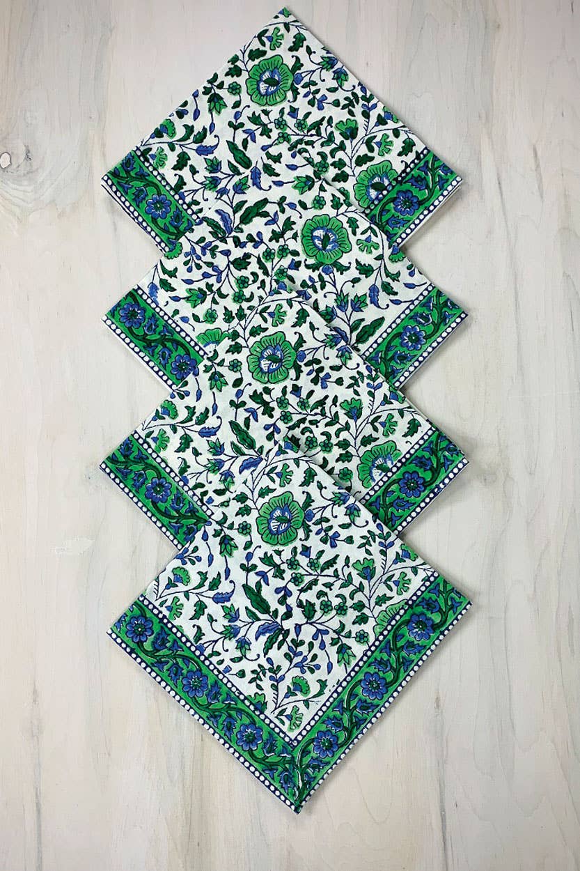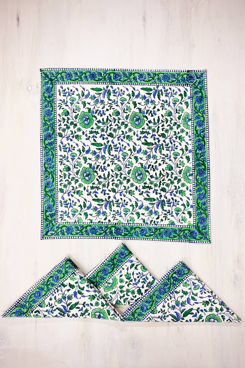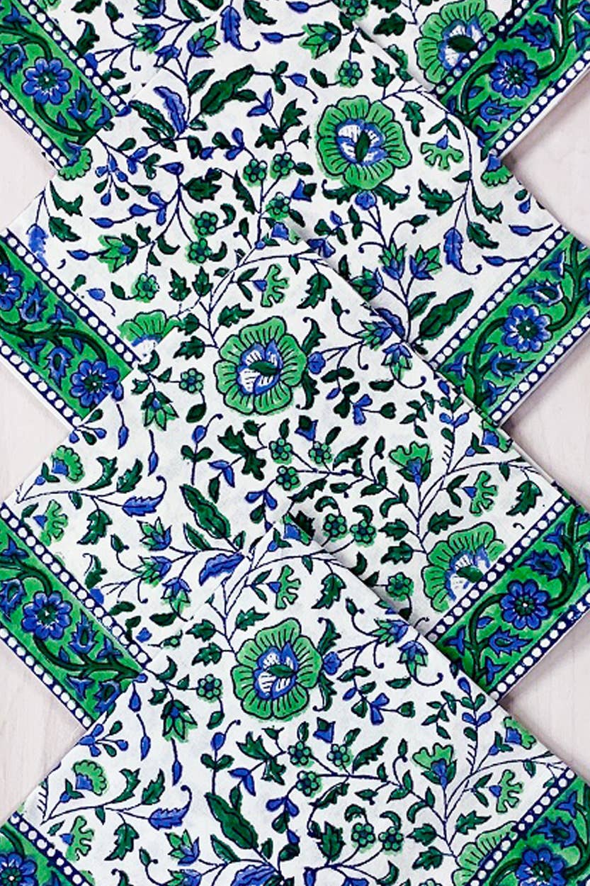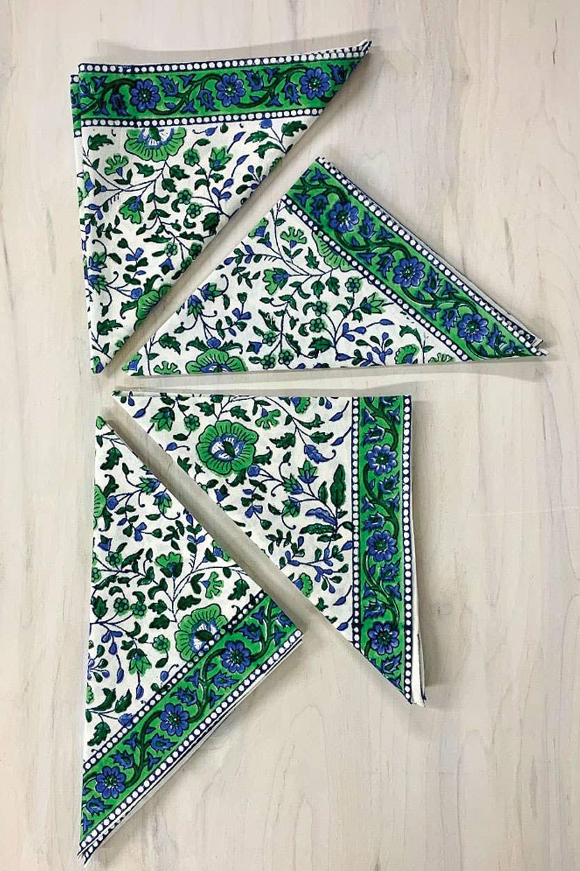 The Jaipur Floral Napkins are made with soft 100% cotton material and is hand block printed by artisans in Rajasthan, India using hand carved wooden blocks. Great skill and precision is required for the artist to create these fine hand block prints, and the natural variations that occur with hand block printed textiles adds to the authentic beauty of each piece. These fair trade napkins have matching table runners and are machine washable. Comes as a set of 4 napkins.