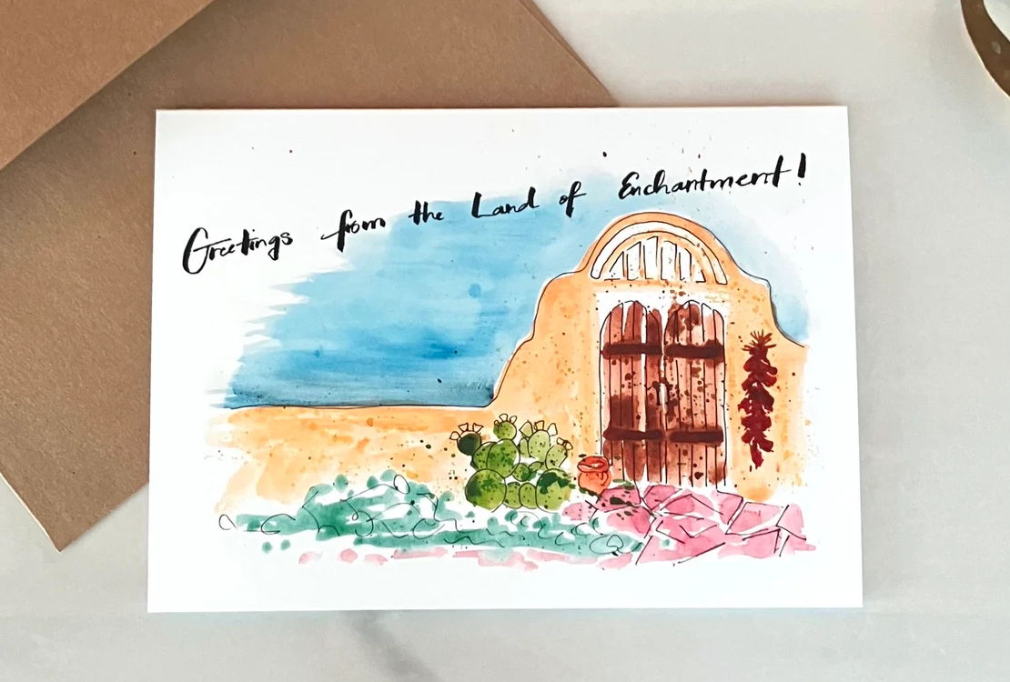 New Mexico adobe wall architecture with Chile ristra and gate with hand lettered message: “Greetings from the Land of Enchantment!”. Printed on a 5 x 7" white folded card with a kraft paper envelope.
