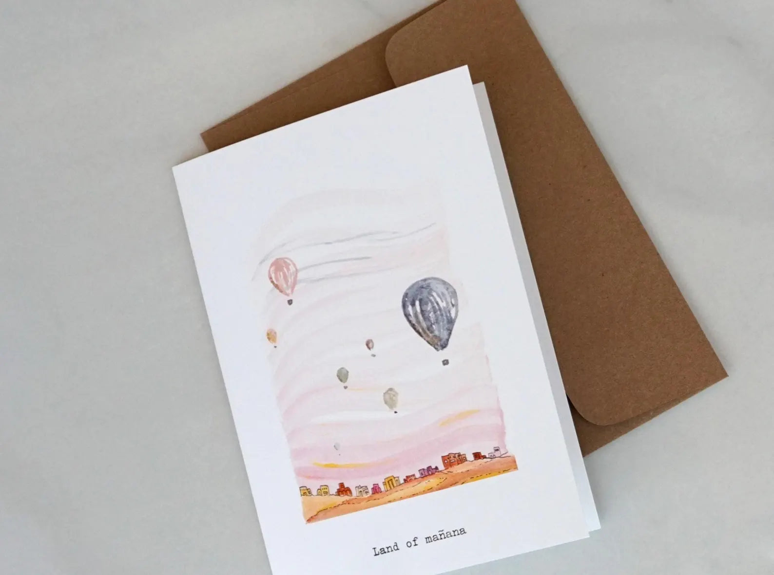 a miniature landscape of southwestern homes dotting the horizon and a big light pink sky filled with hot air balloons and typewritten text: “Land of mañana.” 5x7" white folded card with a white paper envelope.