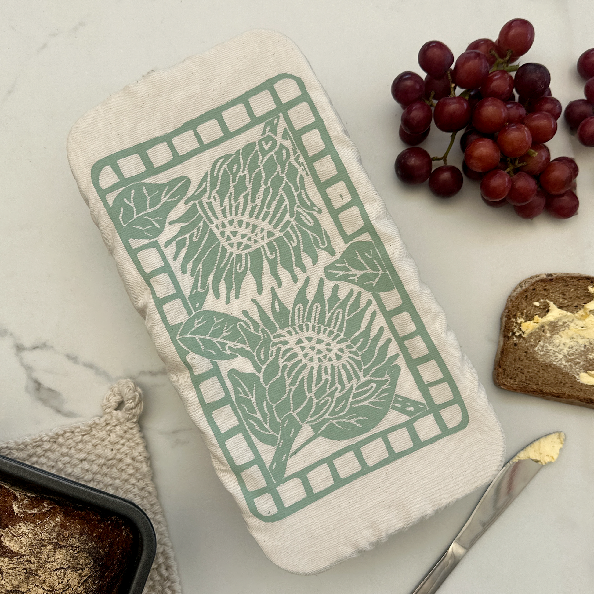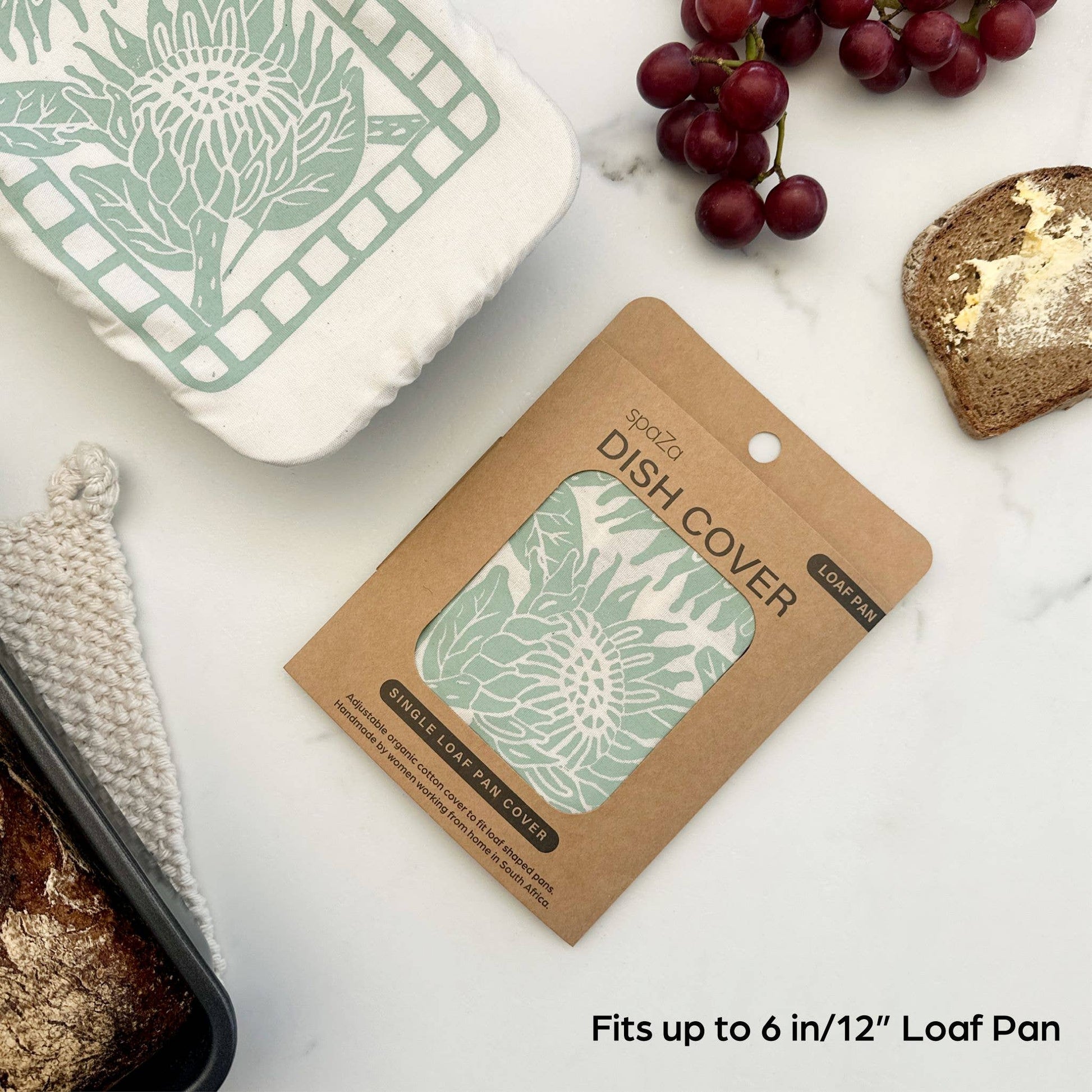 Perfect breathable cover for baked treats in loaf pans or use to proof loaves of bread by dampening and dusting with flour. Adjustable, takes to shape of your dish. Fits 9x5 inch / 12x23cm loaf pan or smaller. 100% GOTS certified organic cotton. Breathable cover which limits condensation. Great alternative for single-use plastics and foils. Microwave safe. Handmade by women working in home industries on the outskirts of Cape Town, South Africa.
