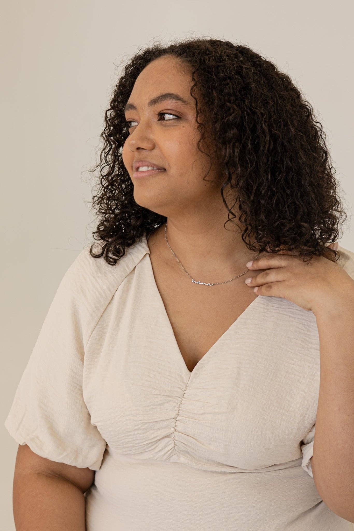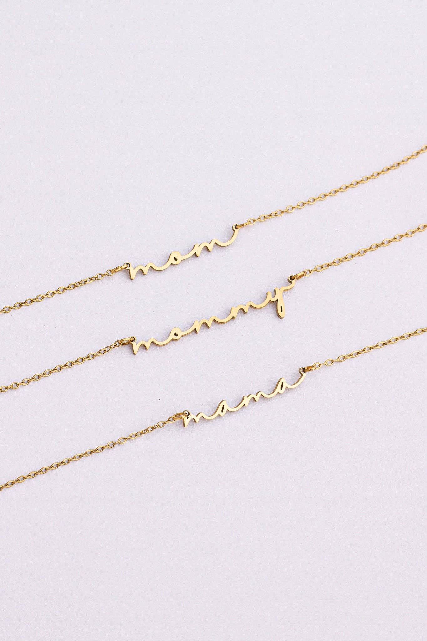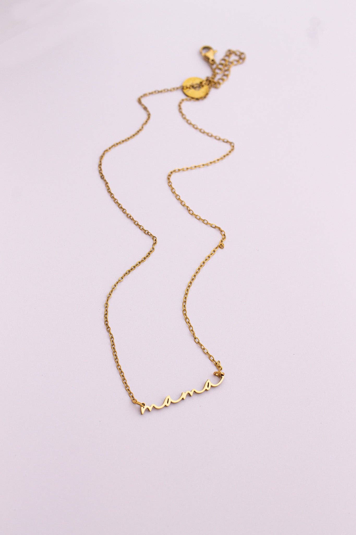 Meet the Mama Necklace! A perfect little dainty piece featuring "mama" written out in cursive script font. Tarnish Free & Waterproof - Shower, Sweat and Pool Safe. Hypoallergenic and Sensitive Skin Safe. 18k Gold Plated Stainless Steel. Adjustable from 16-18.5 inches in length.