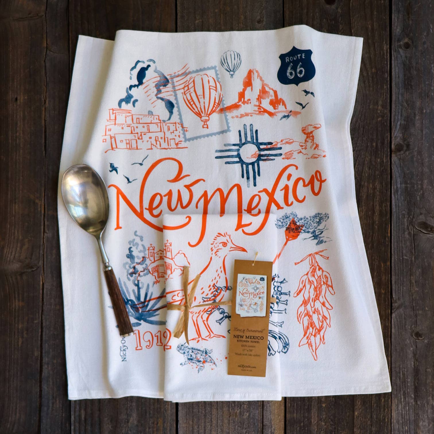 The Land of Enchantment • High-quality 100% cotton 17” x 38” flour sack towel with 2-color print. • Folded and wrapped with a raffia tie and hangtag showing full design. • Perfect packaging for gifting. • Launder in cold with like colors, line or machine dry on low. Souvenir-style kitchen towels show a pride of place or act as a great gift for someone wishing for that "state" of mind. Each illustrated with the state flower, state bird, date of admission to the Union and unique features the state is best known for.