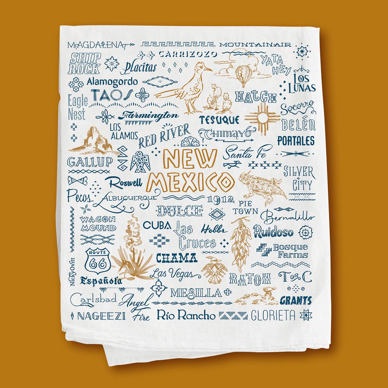 Welcome to New Mexico • High-quality 100% cotton 17” x 38” flour sack towel with 2-color print. • Folded and wrapped with a raffia tie. Launder in cold with like colors, line or machine dry on low. Souvenir-style kitchen towels show a pride of place or act as a great gift for someone wishing for that "state" of mind. Some of the more well-known and unusual town names welcoming visitors to our great state.