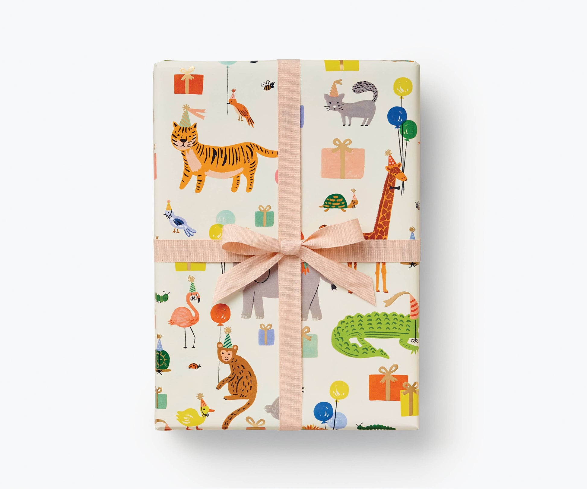 Go wild with this fun Party Animal wrapping paper roll! Features eight feet of paper with colorful illustrations and gridlines on the back. Details: 96" L × 30" W. Coated text weight paper. Printed in full color. One 8 foot roll. Gridlines on the back