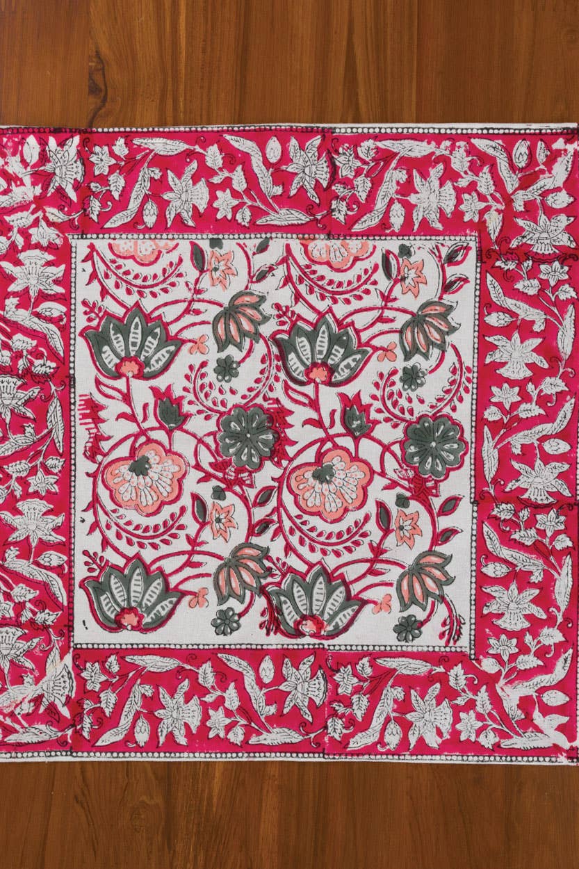 These Red Floral Napkins are made with soft 100% cotton material and is hand block printed by artisans in Rajasthan, India using hand carved wooden blocks. Great skill and precision is required for the artist to create these fine hand block prints, and the natural variations that occur with hand block printed textiles adds to the authentic beauty of each piece. These fair trade napkins have matching table runners. These cotton table linens are machine washable and showcase the beautiful block printing traditions of India with eco-friendly dyes. Comes as a set of 4 napkins.