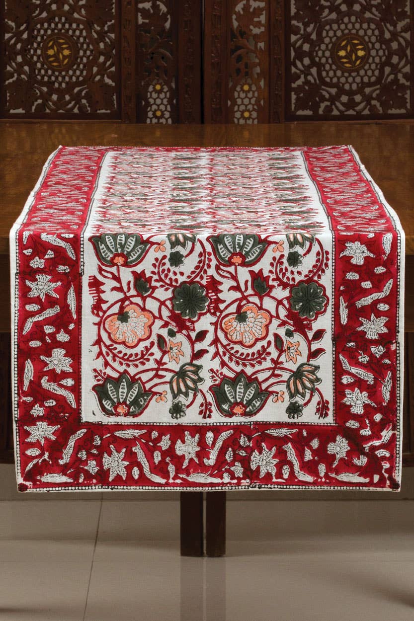 This Red Floral Table Runner is made with soft 100% cotton canvas material and is hand block printed by artisans in Rajasthan, India using hand carved wooden blocks. Great skill and precision is required for the artist to create these fine hand block prints, and the natural variations that occur with hand block printed textiles adds to the authentic beauty of each piece. These fair trade table runners have matching napkin sets and are machine washable.