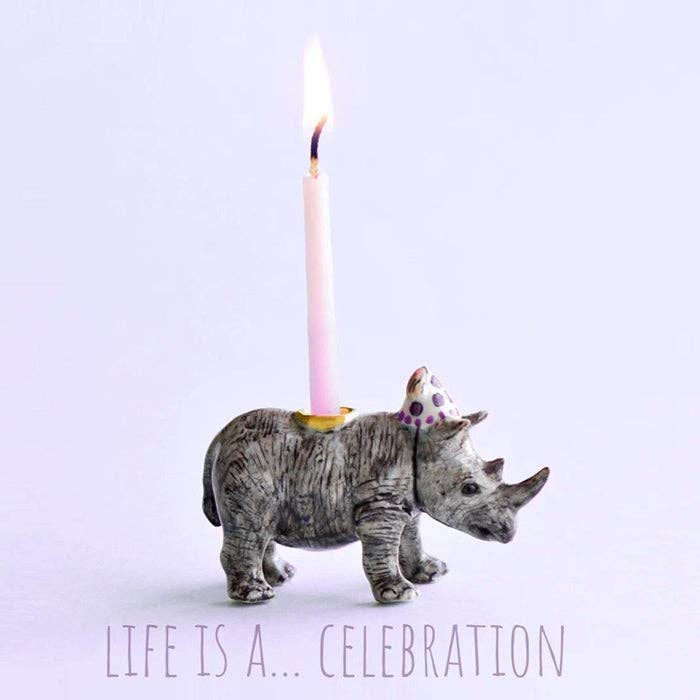 Elevate your special events with Camp Hollow's Rhino Cake Topper. Created from heirloom-quality porcelain and designed to last, these hand-painted masterpieces are unique gifts that will last for years to come. Crafted from fine porcelain and meticulously hand-painted in detail. Includes a beeswax candle and gift box.