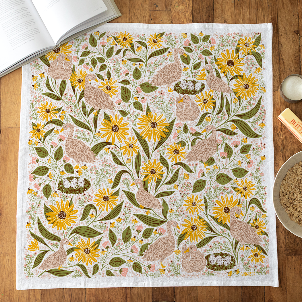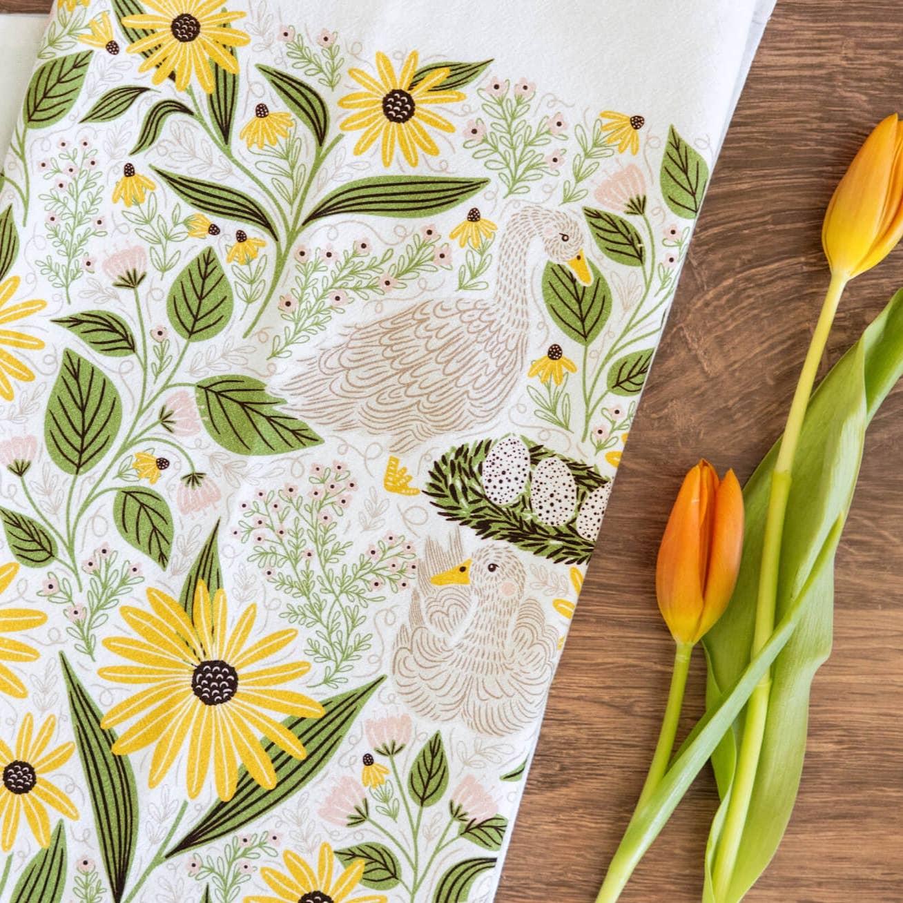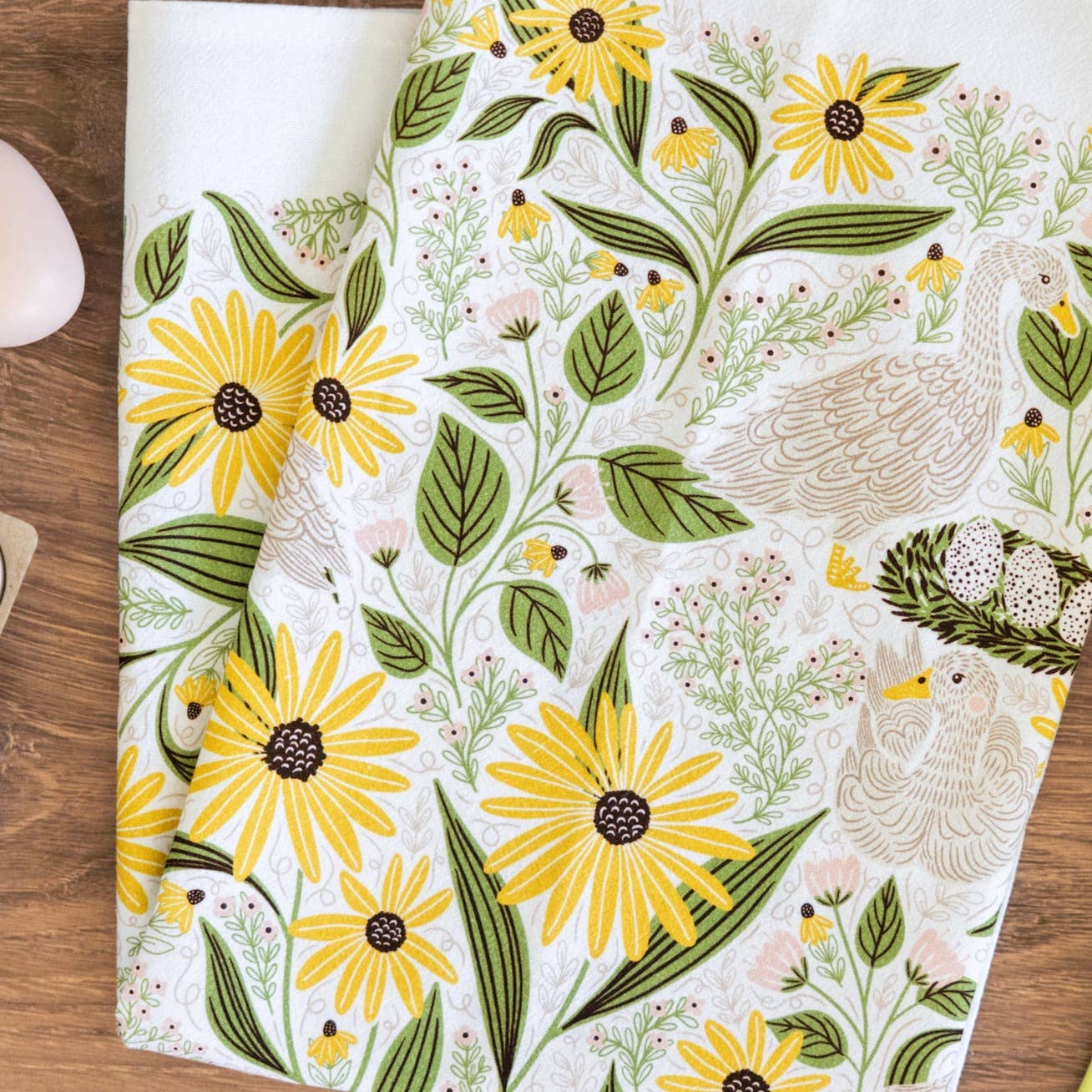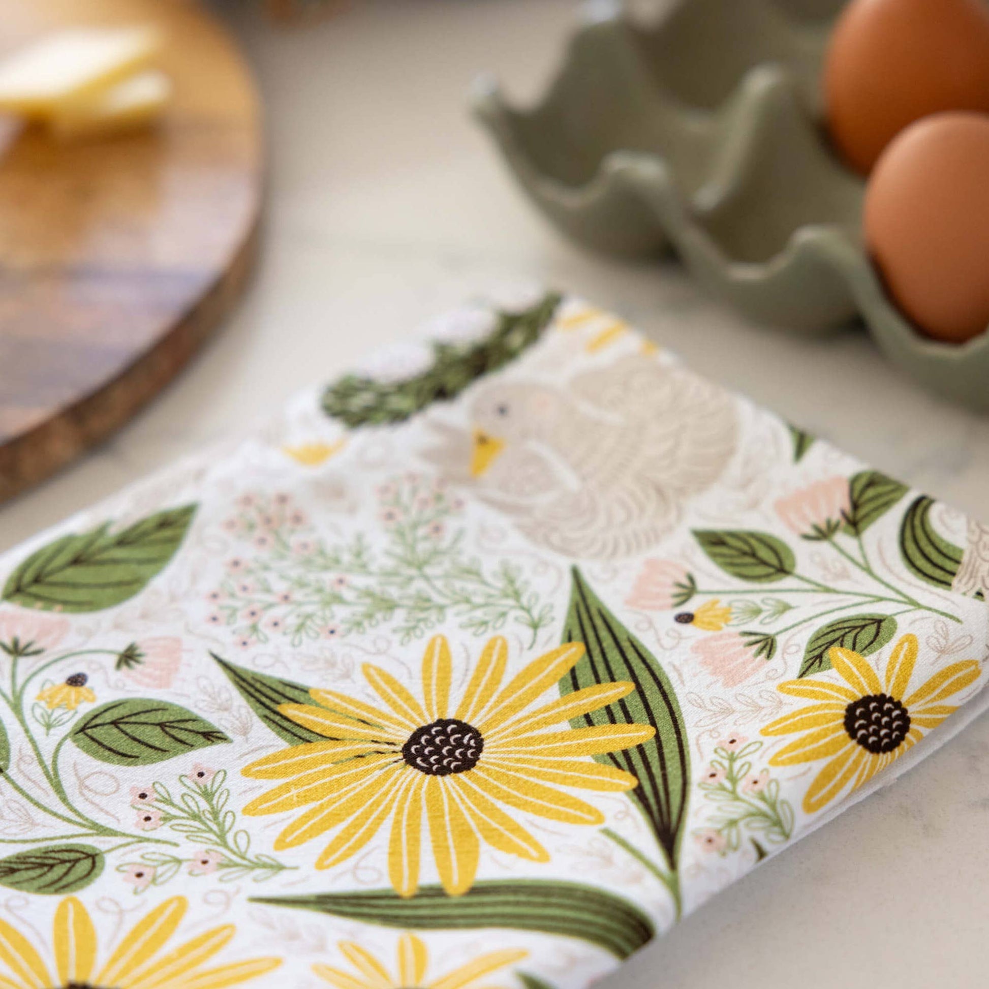 Brighten up your kitchen with a high-quality tea towel featuring gorgeous floral and fauna motifs! These oversized tea towels are both absorbent and beautiful. 100% flour sack cotton. Machine-washable. 24" ×26" inches. Includes a hanging loop.