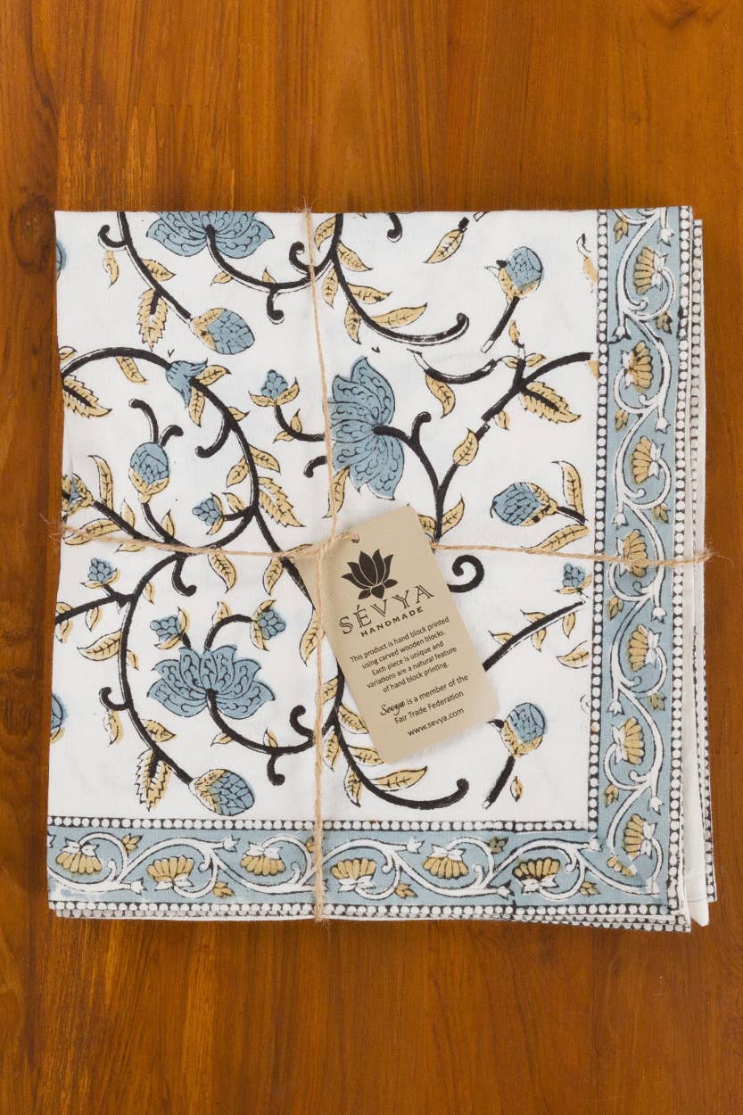 The Silver Floral Napkin Set is made with soft 100% cotton that is hand block printed by artisans in Rajasthan, India using the traditional mud resist printing technique known as “dabu printing”. This art form has been practiced in India for centuries and is a very intricate process involving many steps. The natural variations that occur with mud printing adds to the authentic beauty of each piece. These fair trade napkins have matching table runners. Machine washable. Comes as a set of 4 napkins.
