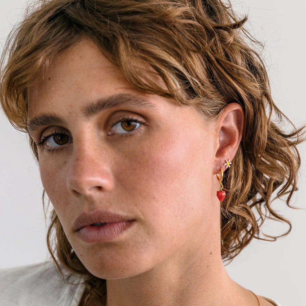 The most delicious, trendiest tiny strawberries ever! They measure 6mm and hang from 14mm huggie hoops. Hoops are brass with a heavy (7-10 mil) 24k gold plate.