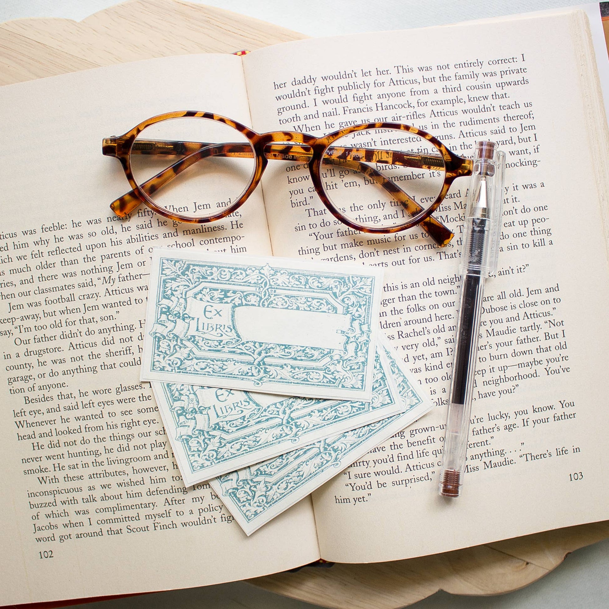 These teal scroll bookplate stickers make a unique, thoughtful "little something" gift for the book lovers in your life. Packaged in a set of five self-adhesive, peel and stick, acid-free sticker labels. Printed on smooth fine stationery quality label sheeting. Approximately 3" across and 2 1/4" high.