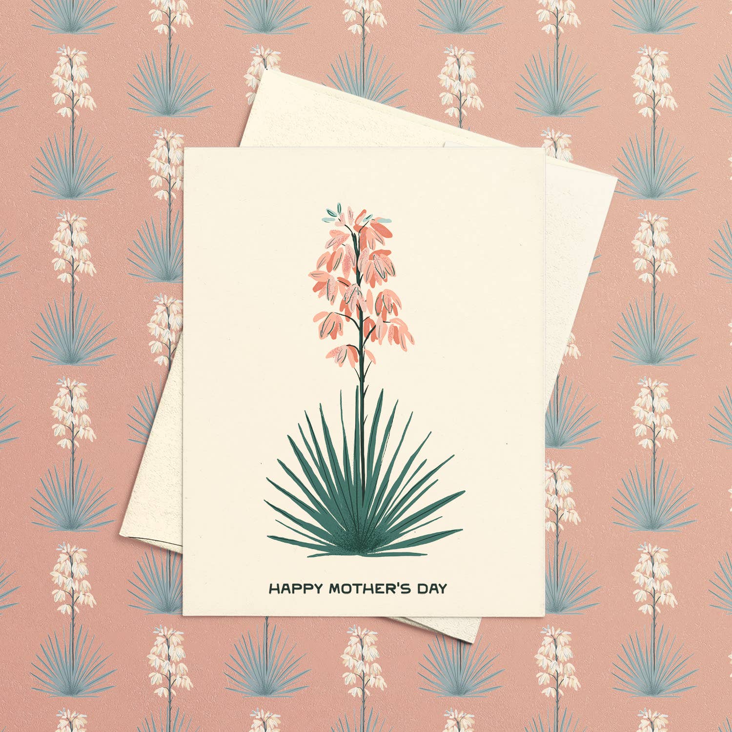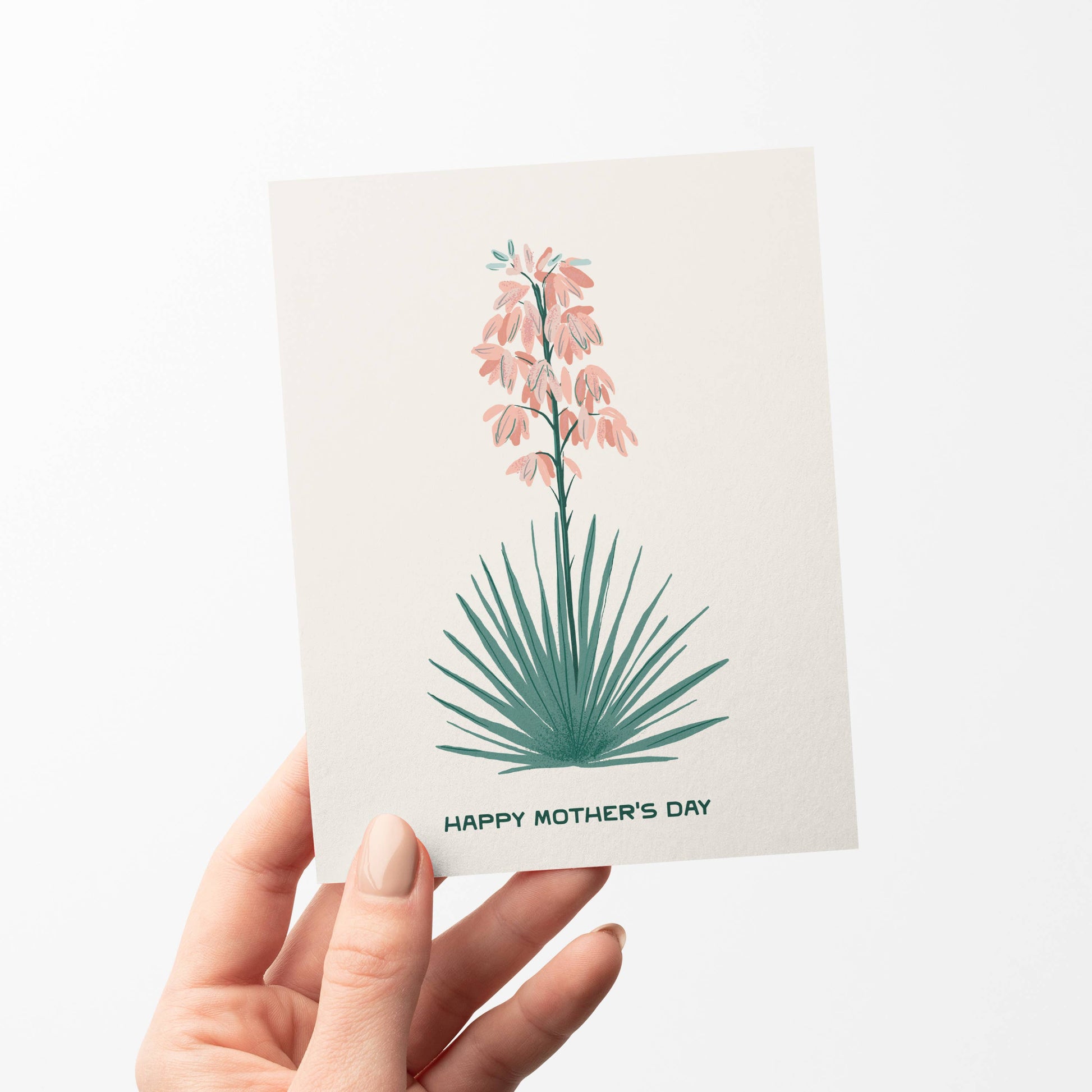 Simple and striking, this Mother’s Day card features a blooming desert plant rising gracefully from a fan of sculptural leaves. The soft coral blossoms and deep green tones create a calm, modern composition, while the message Happy Mother’s Day sits quietly beneath the illustration. Inspired by the quiet beauty of desert flora, the design feels thoughtful and understated—perfect for a mother who appreciates nature and clean, minimalist style.